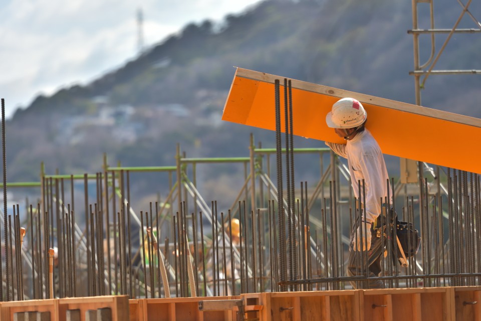 型枠工事は、鉄筋コンクリート建造物の骨組みにコンクリートを流し込むための型を作る作業です。建物の強度や品質に直結するため、精密な施工が求められます。阿南工業では、マンションや学校、病院などの建設現場で、熟練の技術者が高精度な型枠を組み立て、建築の基盤を支えています。